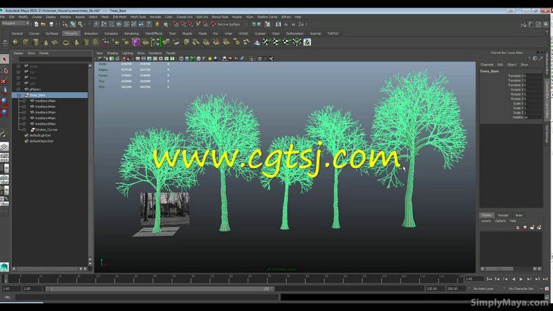 We then create the plants and trees you can see in the render with paint effects before converting them to polygons. We also do a basic camera match and look at various techniques for placing objects with particle systems.